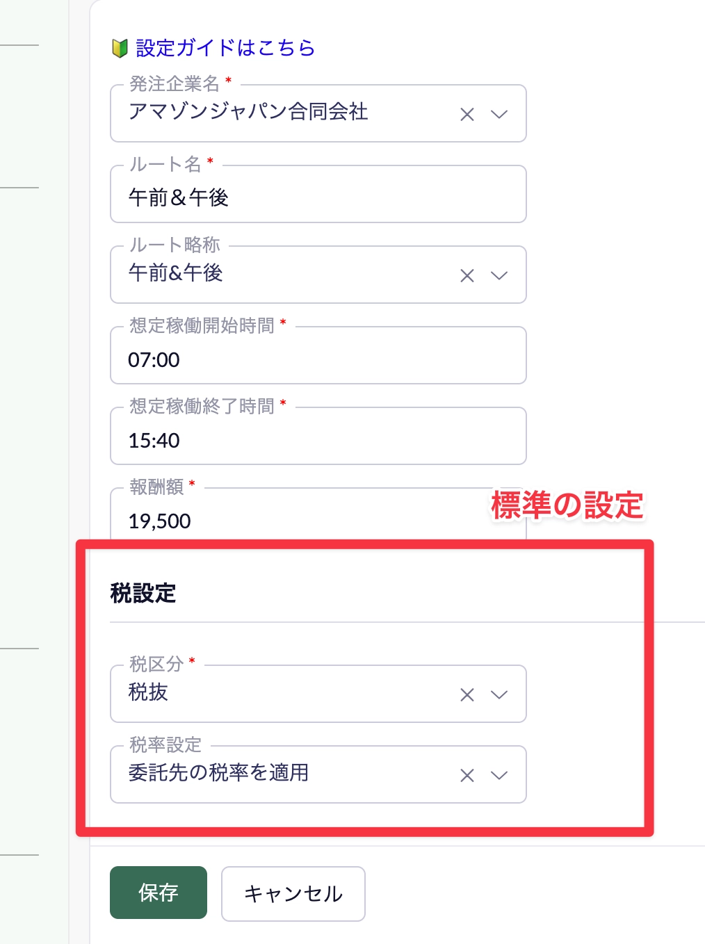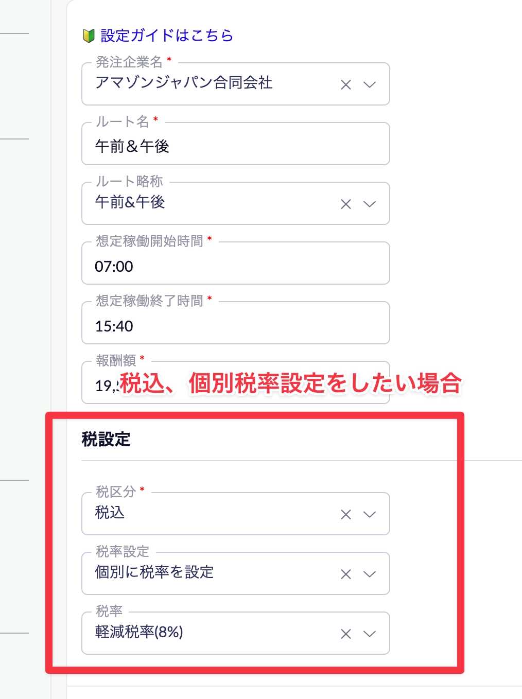 | 個別に税率を設定 | 業務委託配送員の消費税設定にかかわらず、ルート、追加報酬、合意相殺側で消費税設定をします。 |