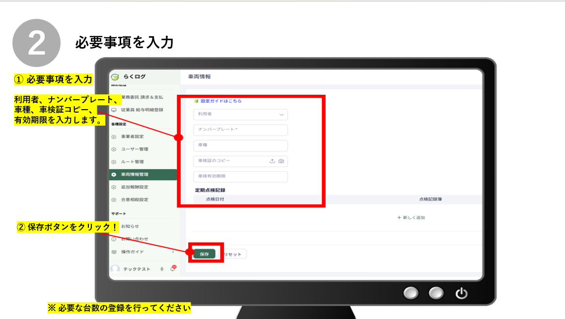 利用者、ナンバープレート、車種、車検証コピー、車検有効期限を入力します。