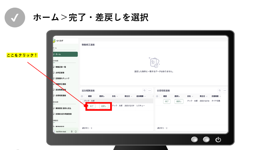 ホーム画面の「追加報酬連絡」セクションで変更内容の確認を行なって、「完了」「差戻し」を選択してください。