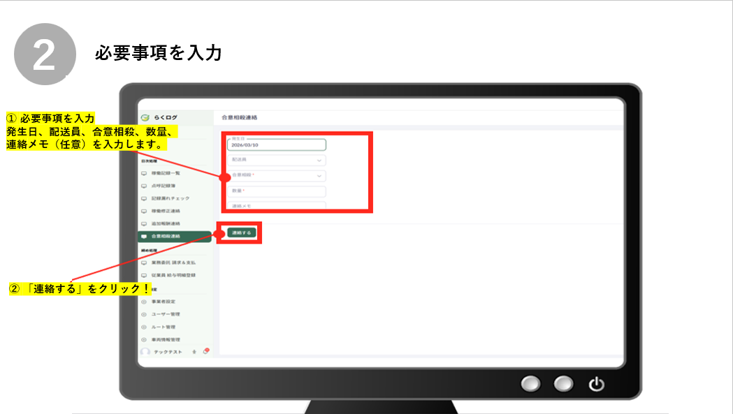 発生日、配送員、合意相殺、数量、連絡メモ(任意)を入力します。