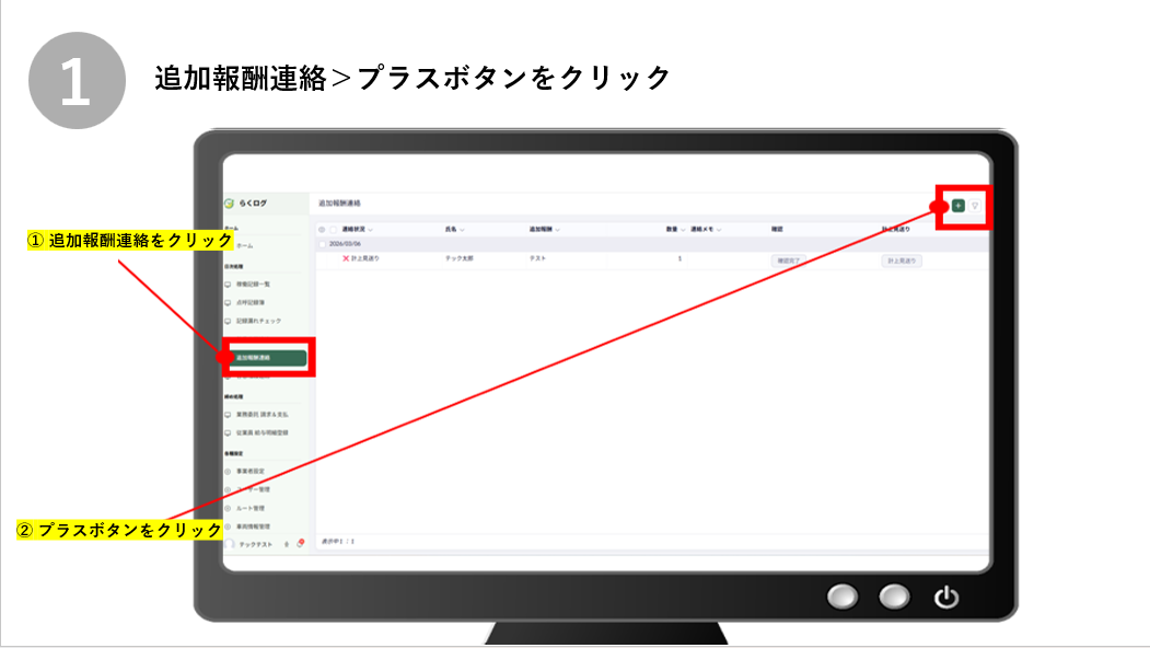 本ページでは、追加報酬・合意相殺の連絡方法についてご説明いたします。 以下の手順に沿って操作を行ってください。 ※添付資料は印刷して使用いただくことも可能です。 事前ステップ:追加報酬・合意相殺の”設定”に関しましては【管理者】のみ行うことができます。 追加報酬連絡 1 【追加報酬連絡】をタップ 2 【データの追加】をタップ 3 必要事項を入力 4 完了 合意相殺 1 【合意相殺連絡】をタップ 2 【データの追加】をタップ 3 必要事項を入力 4 完了
