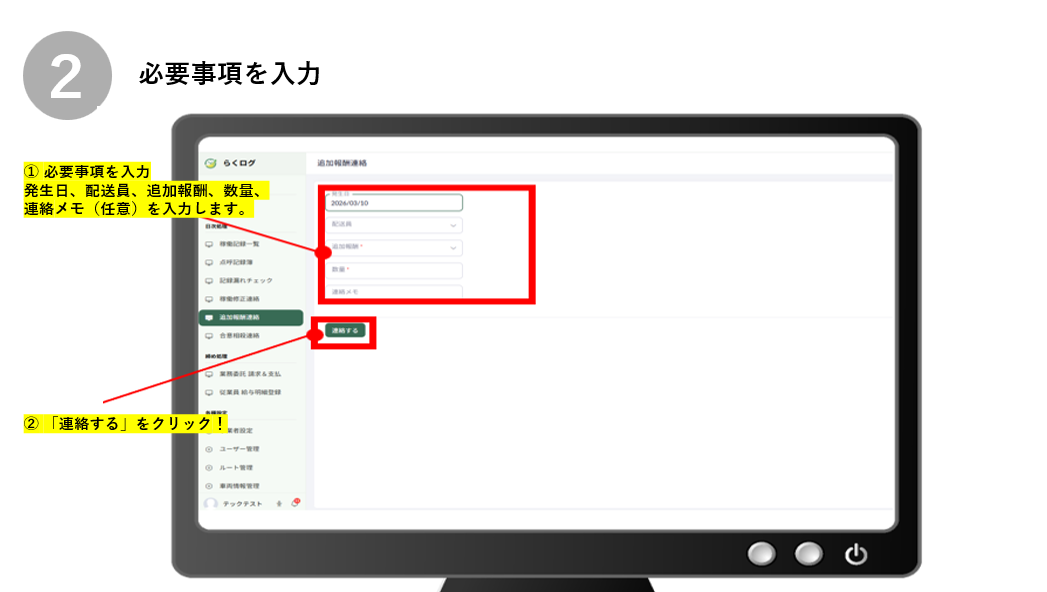 発生日、配送員、追加報酬、数量、連絡メモ(任意)を入力します。