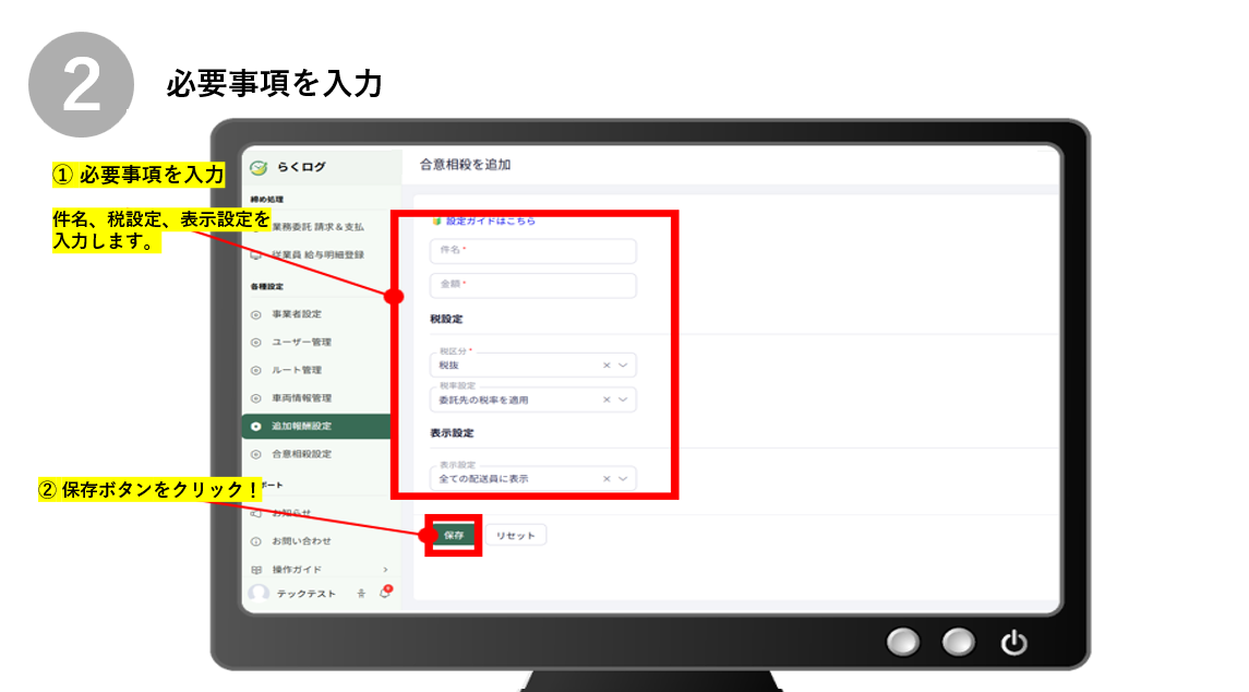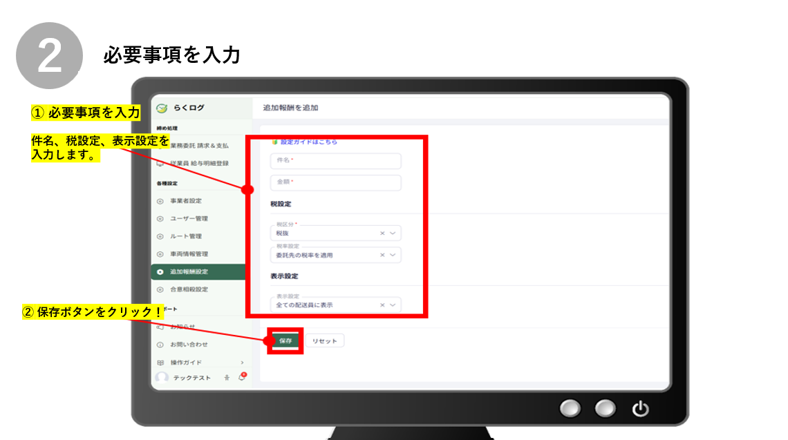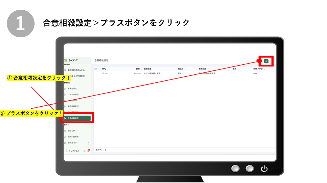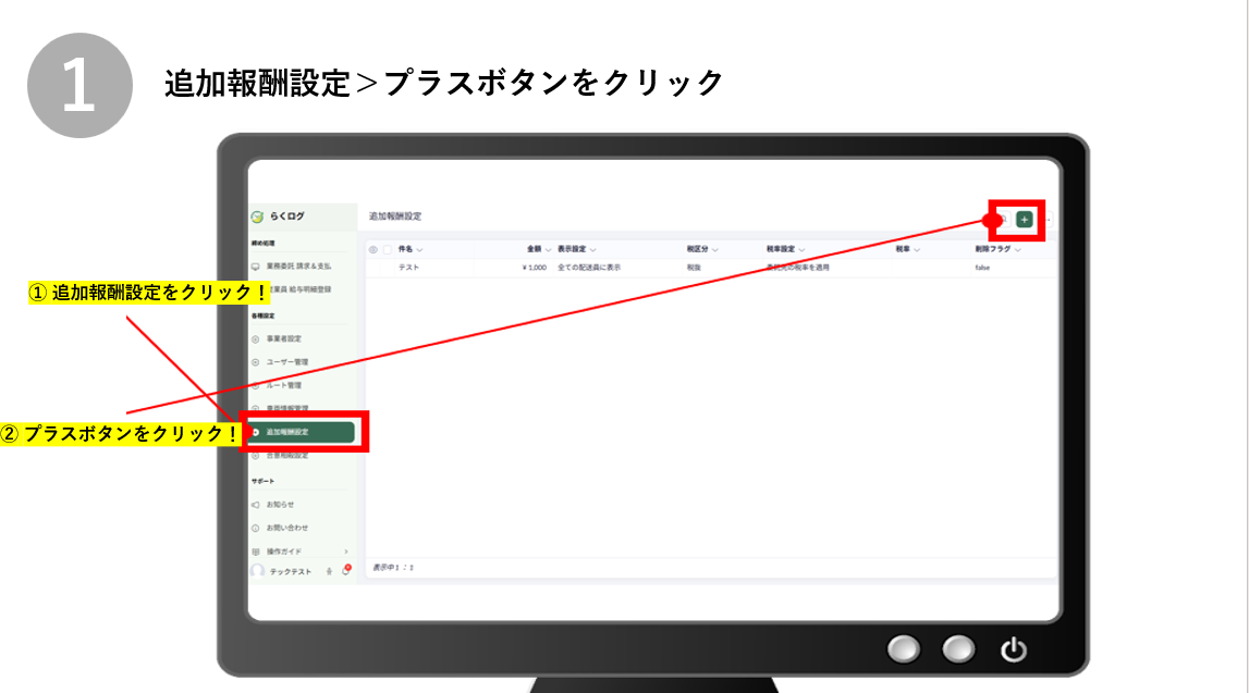 本ページでは、追加報酬・合意相殺の連絡方法についてご説明いたします。 以下の手順に沿って操作を行ってください。 ※添付資料は印刷して使用いただくことも可能です。 事前ステップ:追加報酬・合意相殺の”設定”に関しましては【管理者】のみ行うことができます。 追加報酬連絡 1 【追加報酬連絡】をタップ 2 【データの追加】をタップ 3 必要事項を入力 4 完了 合意相殺 1 【合意相殺連絡】をタップ 2 【データの追加】をタップ 3 必要事項を入力 4 完了