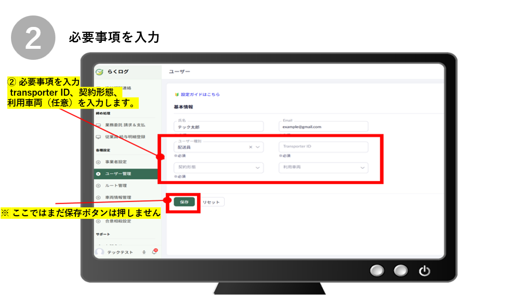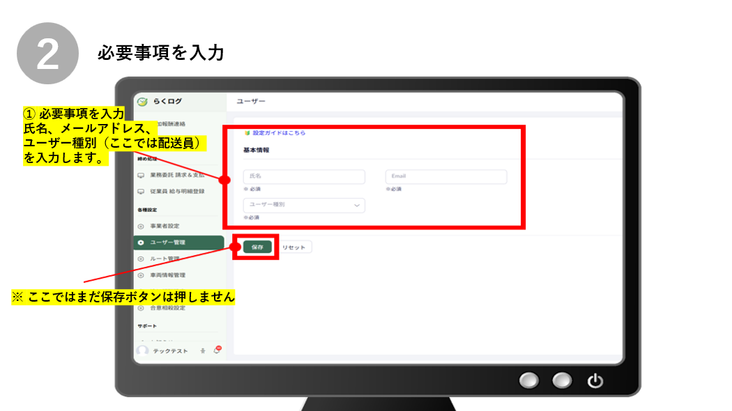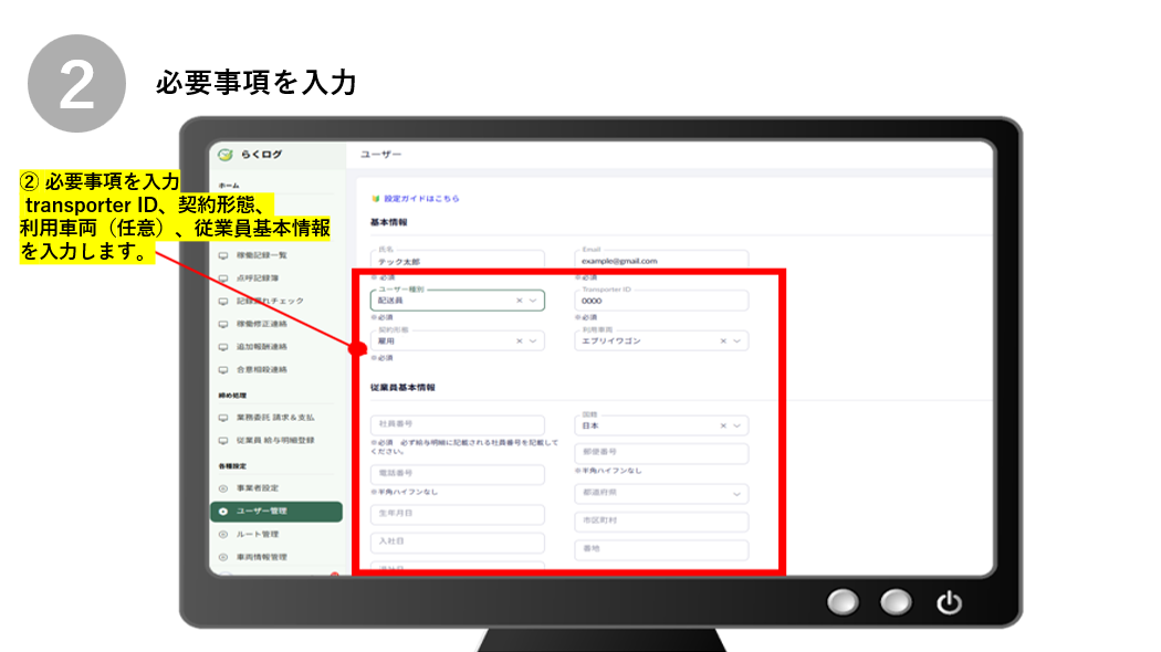 ① 氏名、メールアドレス、ユーザー種別(配送員)を入力します。