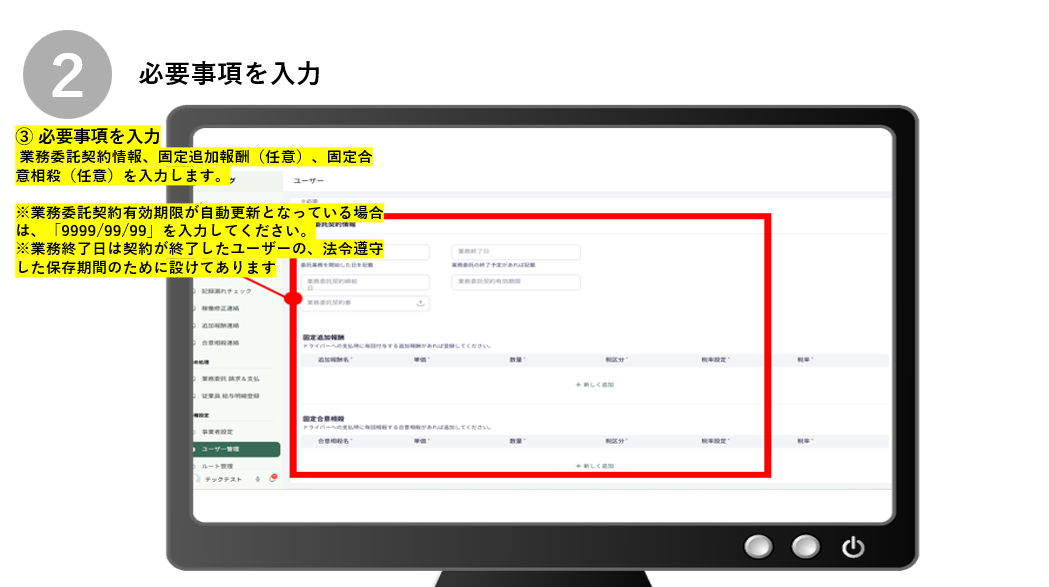 ※業務委託契約有効期限が自動更新となっている場合は、「9999/99/99」を入力してください。