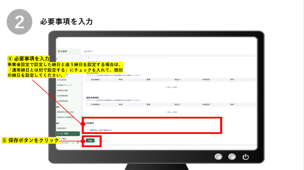 ④ 事業者設定で設定した締日と違う締日を設定する場合は、