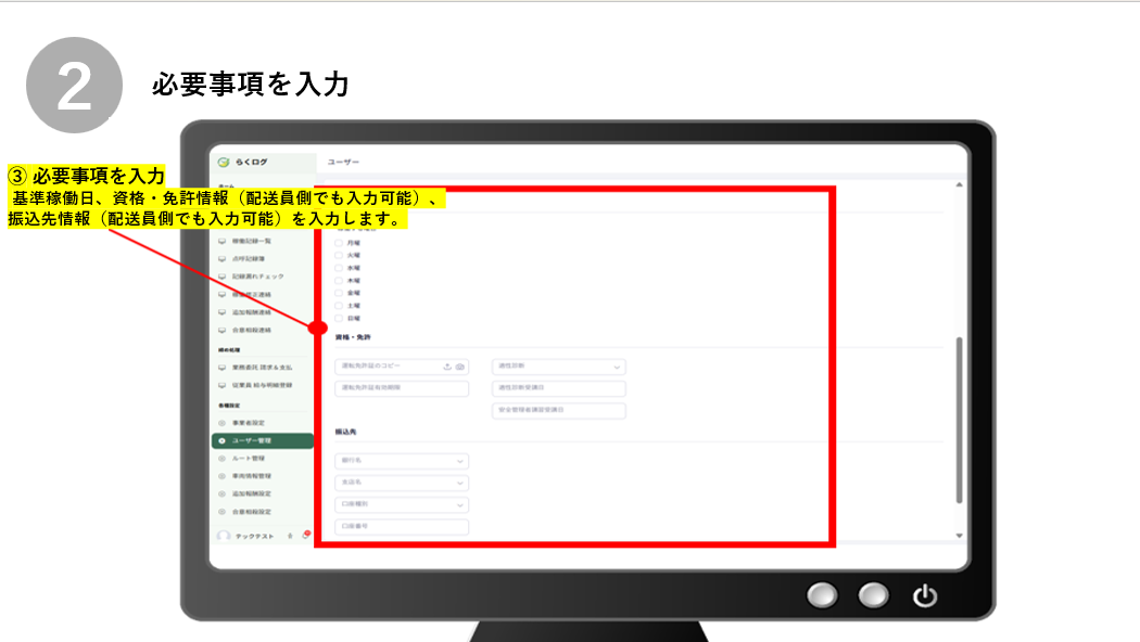 ※免許・資格情報、個人事業主情報、報酬振込先は配送員側での入力となります。