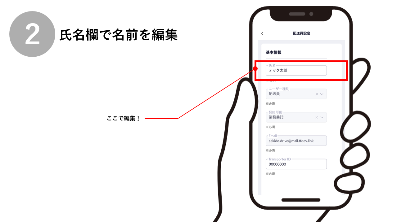 本ページでは、管理者による配送員の招待方法についてご説明いたします。 以下の手順に沿って設定を行ってください。 ※添付資料は印刷して使用いただくことも可能です。 配送員ユーザーの招待(業務委託の場合) 1 ユーザー管理>プラスボタンをクリック 2 必要事項を入力 ① 氏名、メールアドレス、ユーザー種別(配送員)を入力します。 ② transporterID、契約形態、利用車両(任意)を入力します。 ③ 業務委託契約情報、固定追加報酬(任意)、固定合意相殺(任意)を入力します。 ...