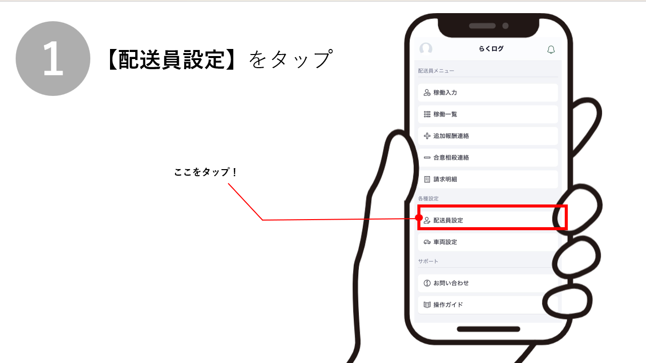 本ページでは、利用開始前に必要な初期設定の方法についてご説明いたします。 下記の手順に沿って設定を行ってください。 ※添付資料は印刷して使用いただくことも可能です。 事前ステップ:管理者が配送員登録を行うと、配送員に招待メールが届きます。必ずメール内のリンクをタップして画面へ移行してください。 1 パスワードの設定>アプリインストール パスワードはセキュリティの観点でメールアドレスに含まれるキーワードと同じものは使用できません。 2 案内に沿って初期設定 ...