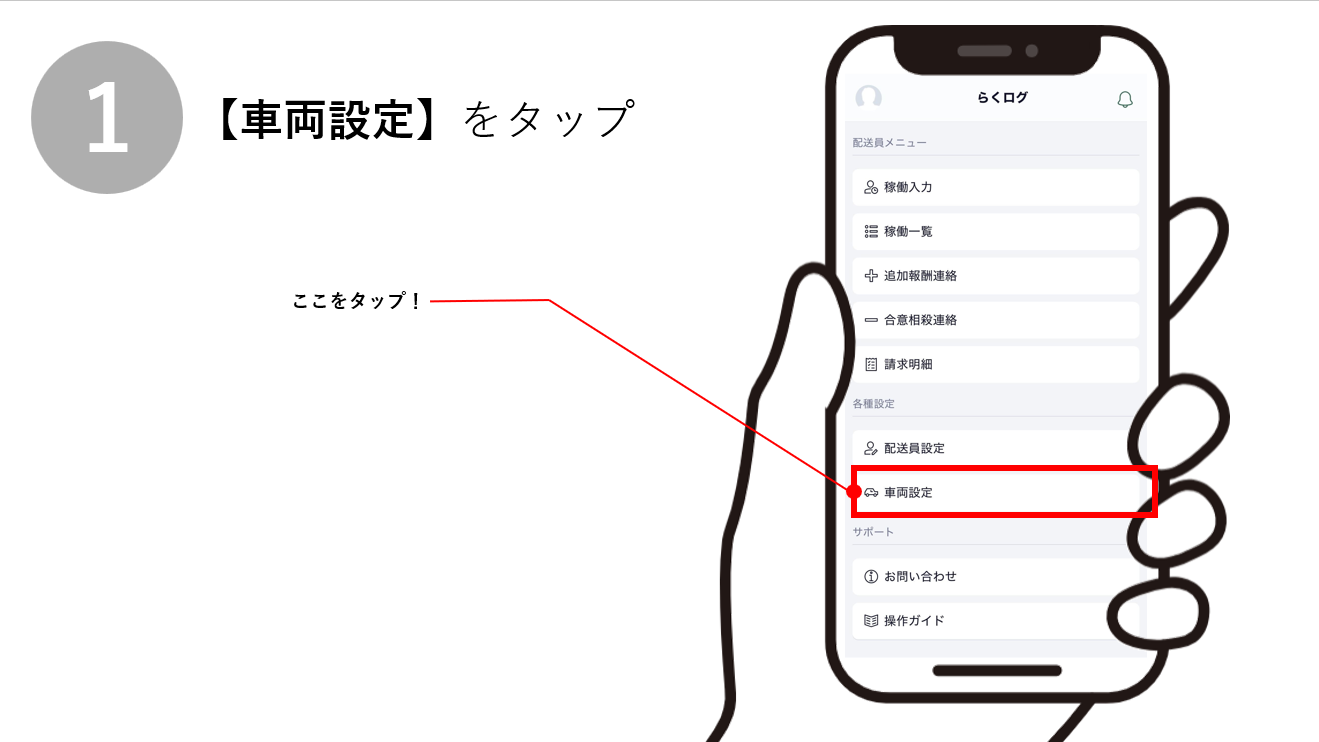 本ページでは、配送員の名前の変更方法についてご説明いたします。 以下の手順に沿って、削除を実施してください。 ※添付資料は印刷して使用いただくことも可能です。 1 配送員設定をタップ 2 氏名欄で名前を編集 3 3 完了